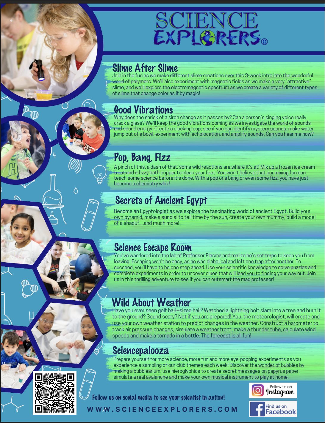 At the end of each club meeting, you will receive a parent page that covers all of the information your child learned and activities you can do together to enhance the lesson. If your child made anything during the meeting, they can bring it home with them. Like our summer camps, we have many repeat attendees and frequently create new club themes to keep kids excited about learning.