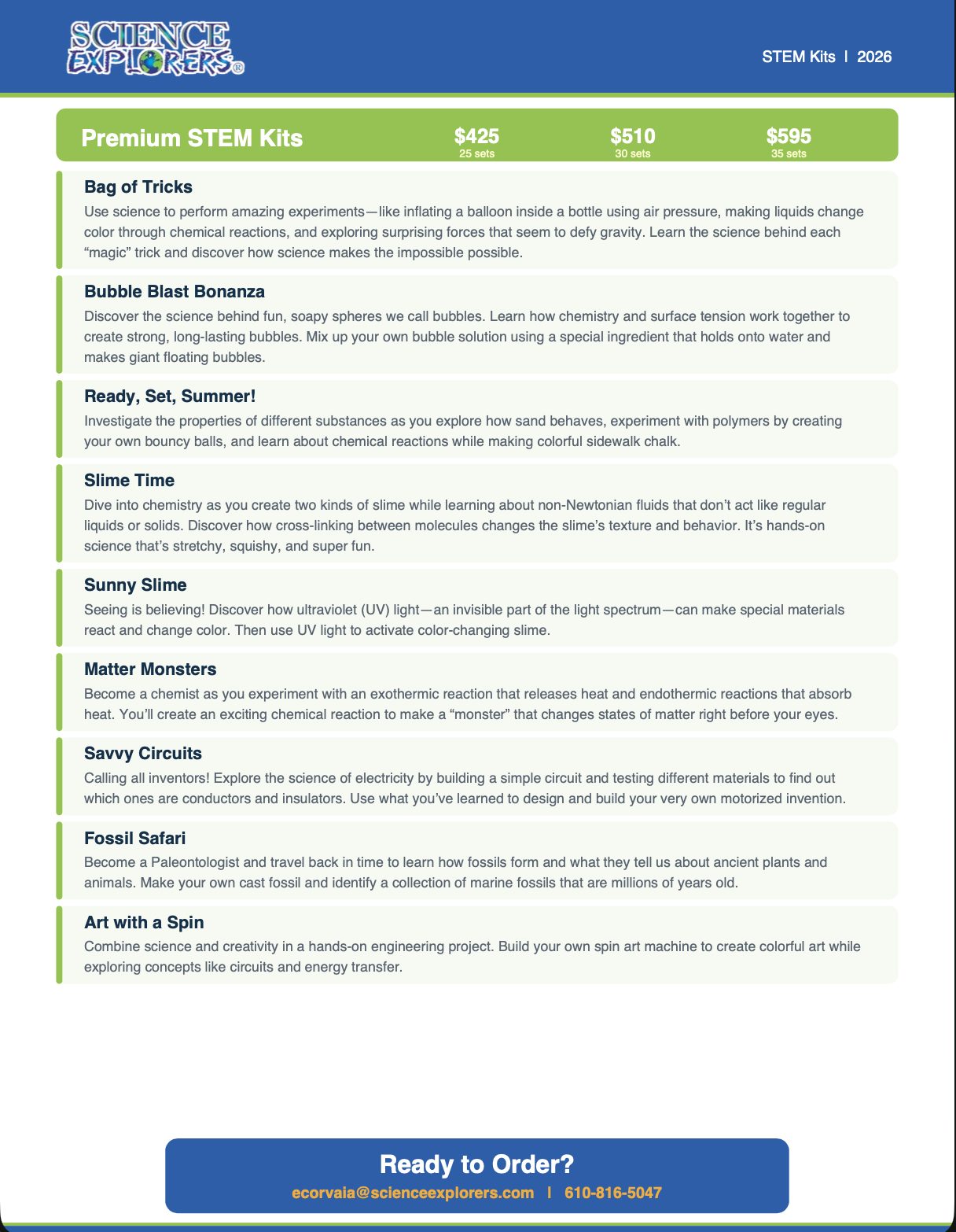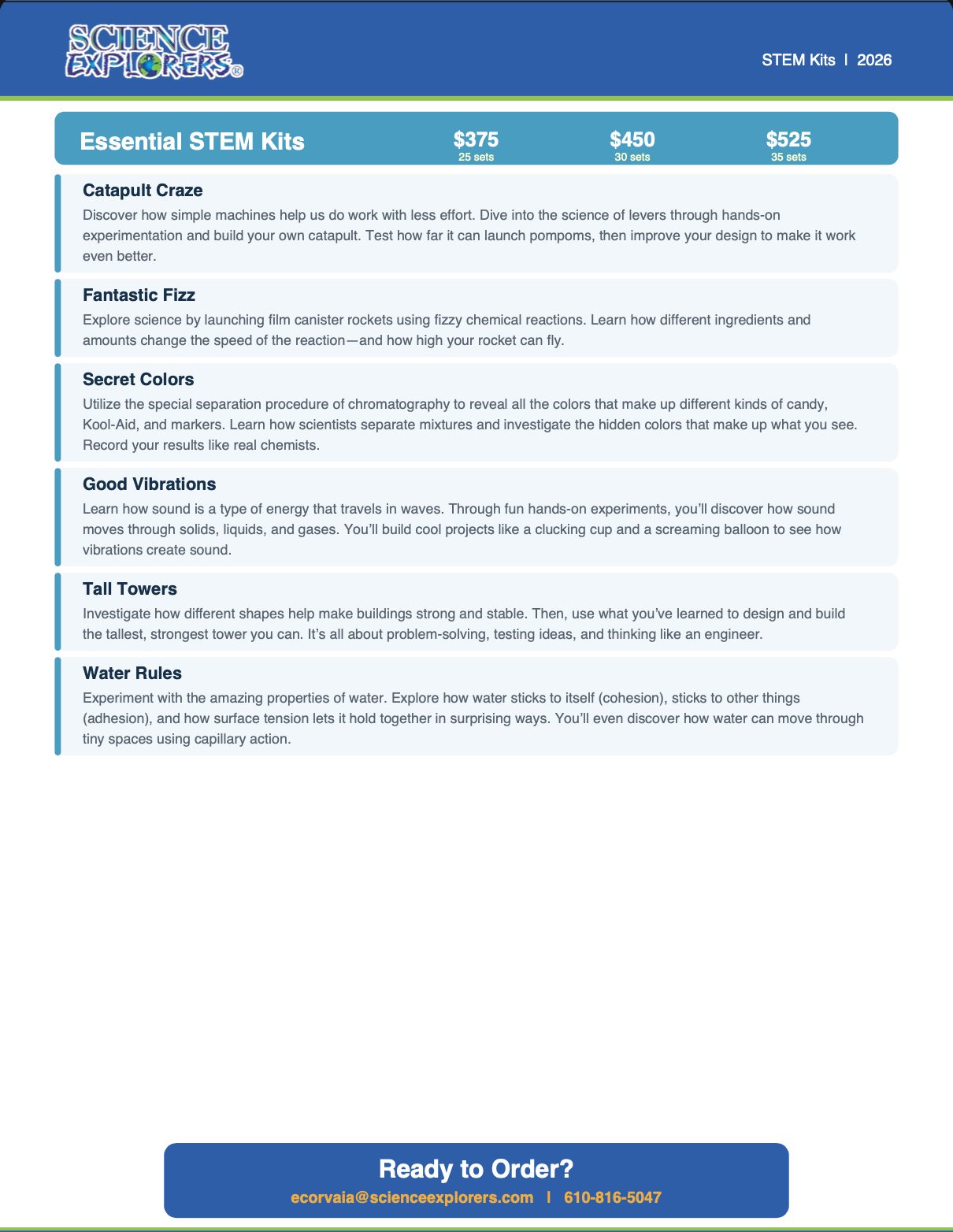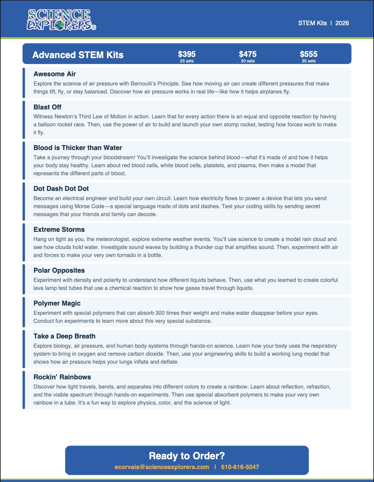 • Each kit includes all materials, a complete curriculum, and simple instructor-training videos—so you can plug hands-on STEM learning into your program.